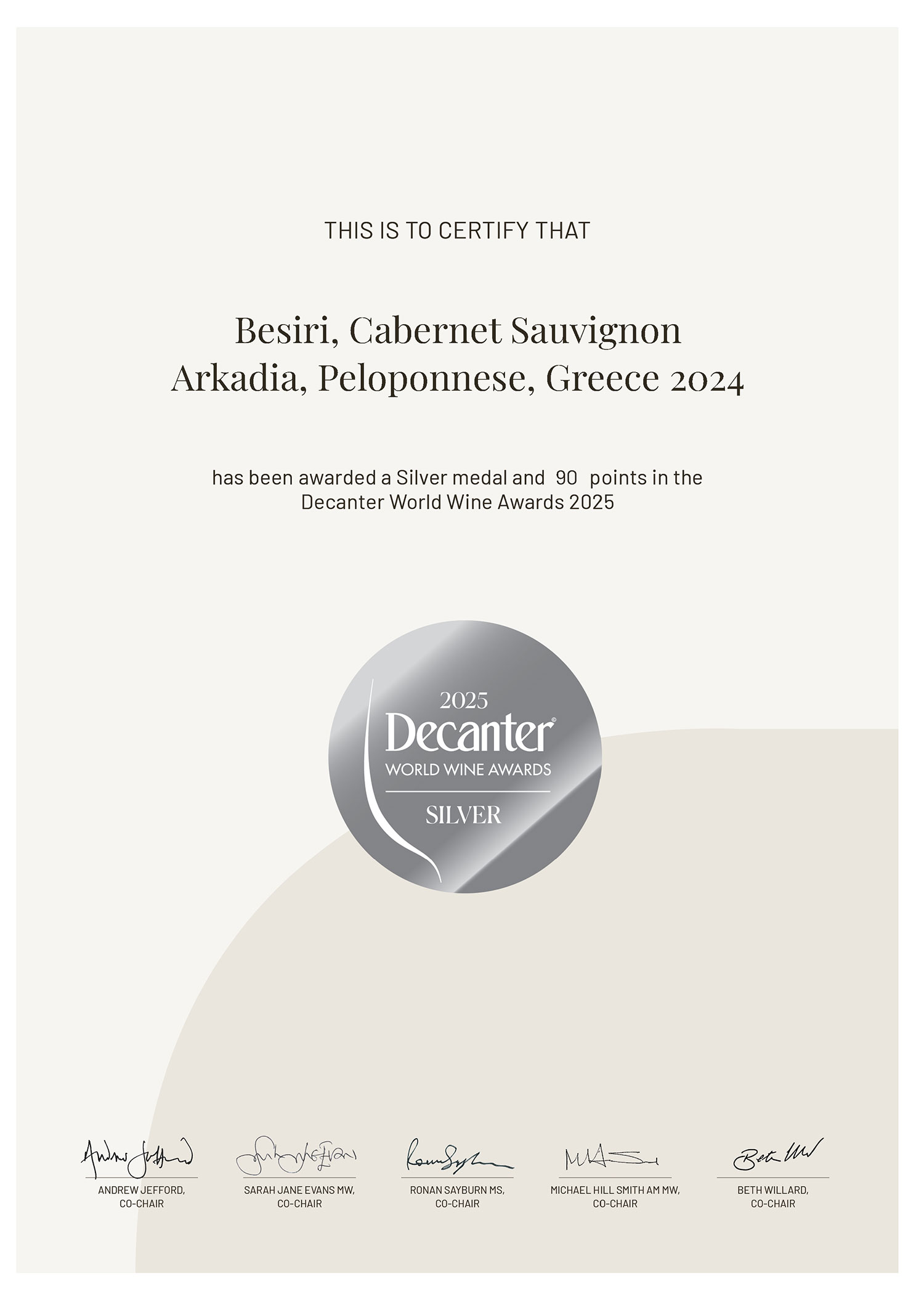Tο Besiri Cabernet Sauvignon πήρε ασημένιο στην DECANTER World Wine Awards με 90 βαθμούς, 13ο στον κόσμο ανάμεσα σε 110 κρασιά της ίδιας ποικιλίας και ίδιας χρονιάς !!