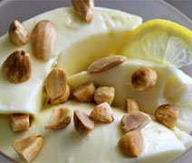 Ξεκινάω με το καβούρδισμα των αμυγδάλων σε ανοιχτό σκεύος σε χαμηλή φωτιά (2/9) για 15? περίπου μέχρι να ροδίσουν. Ανακατεύω τακτικά τα αμύγδαλα για να μην αρπάξουν, γιατί αυτό μπορεί να γίνει πολύ εύκολα. Λιώνω το ζελέ με το 1 φλ. βραστό νερό. Στραγγίζω τον χυμό λεμονιού και τον προσθέτω κι αυτόν στο ζελέ. Αφήνω το μείγμα στην άκρη να γίνει χλιαρό και στην συνέχεια προσθέτω το στραγγιστό γιαούρτι, το ζαχαρούχο γάλα και τέλος το ξύσμα λεμονιού. Ανακατεύω με τον αυγοδάρτη να ενωθούν όλα τα υλικά και στην συνέχεια παγώνω το επιδόρπιο καλά στο ψυγείο για ένα βράδυ τουλάχιστον προτού το σερβίρω την επομένη. Την επομένη που έχει πήξει το γλυκό το σερβίρω και το γαρνίρω με τα καβουρδισμένα αμύγδαλα ή τα τριμμένα μπισκότα digestive.