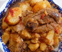 Καταρχην τα κομματακια του κρεατος θα τα βαλετε για μια ωρα μεσα σε νερο με το ξυδι για να φυγει η μυρωδια. Μετα θα τα βαλετε στην κατσαρολα με νερο για τα ζεματισετε. Όταν αρχισουν να βραζουν θα τα βγαλετε και θα τα πλυνετε καθαρα. Σε αλλη κατσαρολα θα βαλετε το λαδι μαζι με το σκορδο, το κρεμμυδι και το κρεας να γιαχνιστουν, θα βαλετε τα μπαχαρικα, θα τα σβησετε με το κρασι, θα βαλετε τη ντοματα και θα τα βρασετε στη χυτρα για περιπου 1 ωρα.